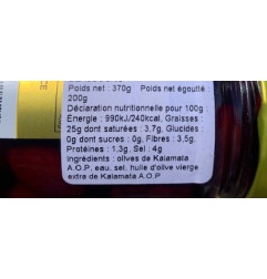 Ingrédients : Olives de Kalamata AOP, Eau, Sel, huile d'Olive Vierge Extra de Kalamata AOP
